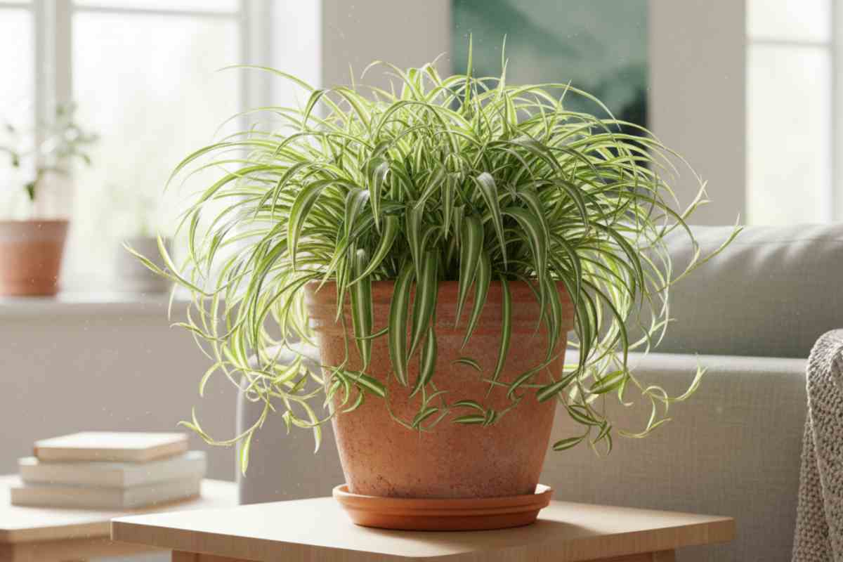 Una cascata di foglie striate scende dal ripiano e cambia il respiro della stanza. Il “nastro di sposa” non fa rumore, non chiede attenzioni speciali. Ma mentre tu vivi il salotto, lui lavora in silenzio.